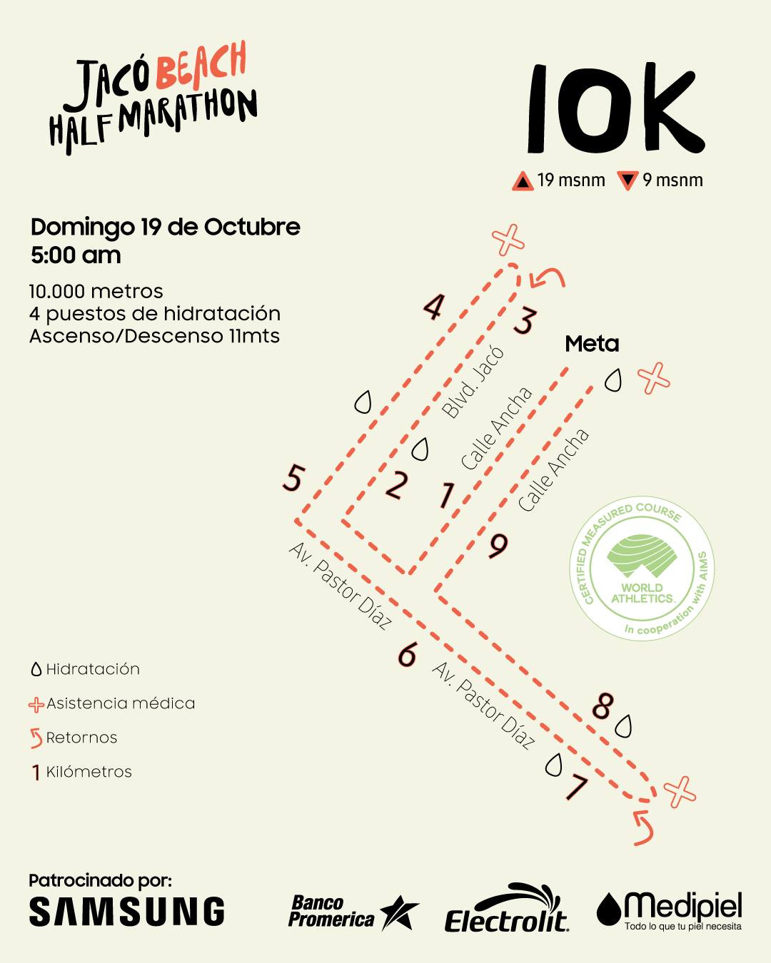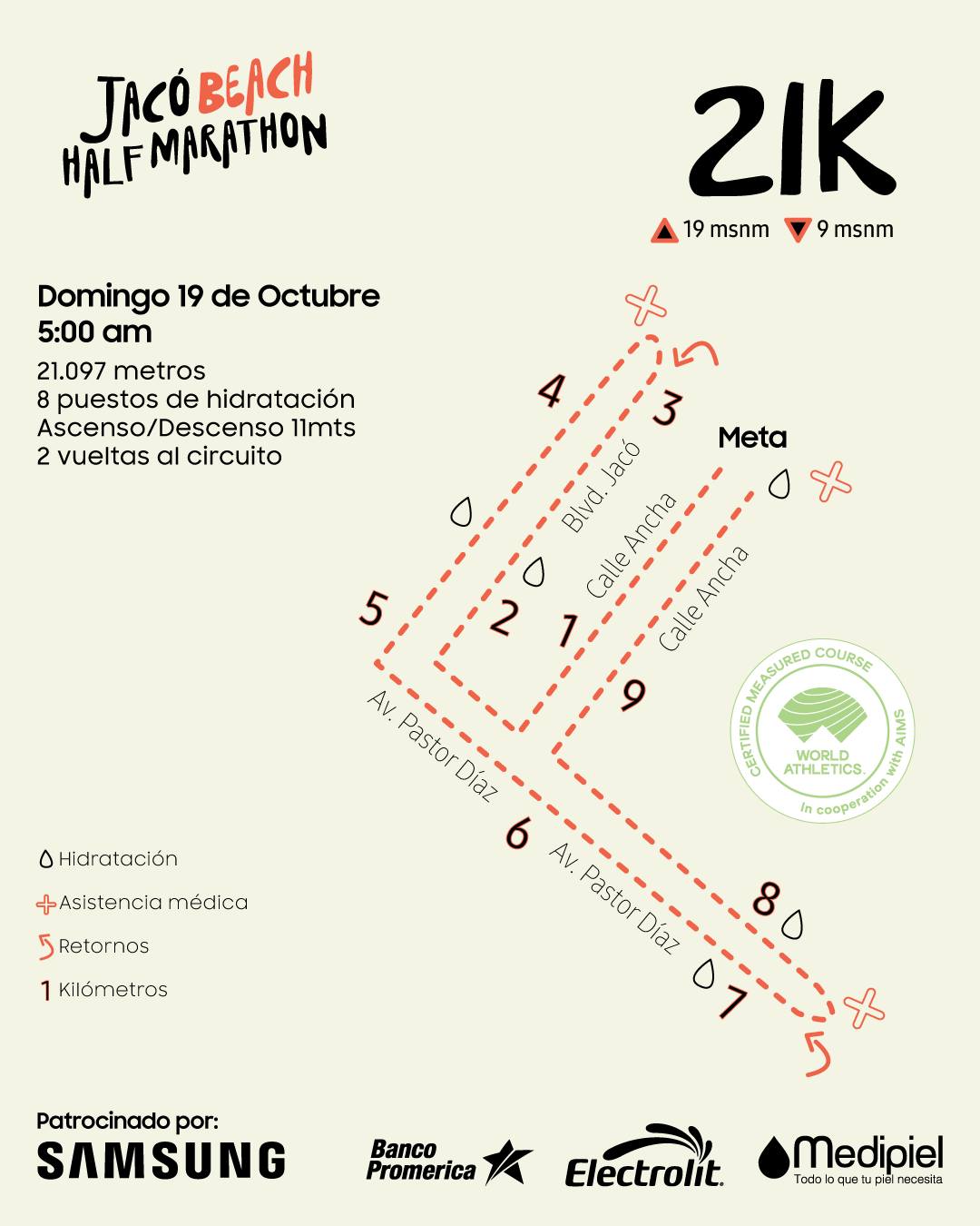 Descripción: Será la tercera edición de la Samsung Jacó Beach Half Marathon, y conservará sus tradicionales distancias de 5k, 10k y 21k, todas certificadas por World Athletics. Los recorridos son 100% sobre asfalto y muy planos, con la fantástica playa de Jacó como telón de fondo. La salida será a las 5:00 a.m. por lo que el clima deberá ser aún algo fresco y el amanecer nos pescará en plena carrera. La ruta de 21k es la misma de 10.5k que se hace dos veces (ver mapa abajo).