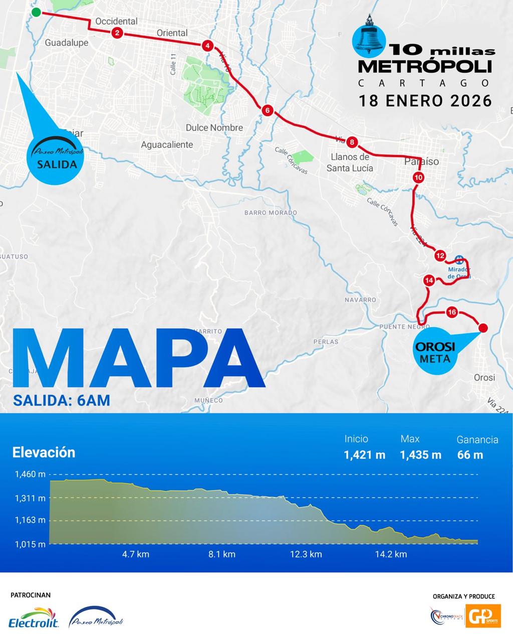 Descripción: La carrera 10 Millas Cartago es una clásica de principios de año. Su favorable recorrido de 10 millas (16 kilómetros) saliendo desde Paseo Metrópoli y llegando a Orosi le da la oportunidad a los corredores de hacer excelentes tiempos a la vez que disfrutan de una ruta diferente y con vistas hermosas hacia el Valle de Orosi. El recorrido tiene un descenso neto de 377 metros desde la salida hasta la meta.