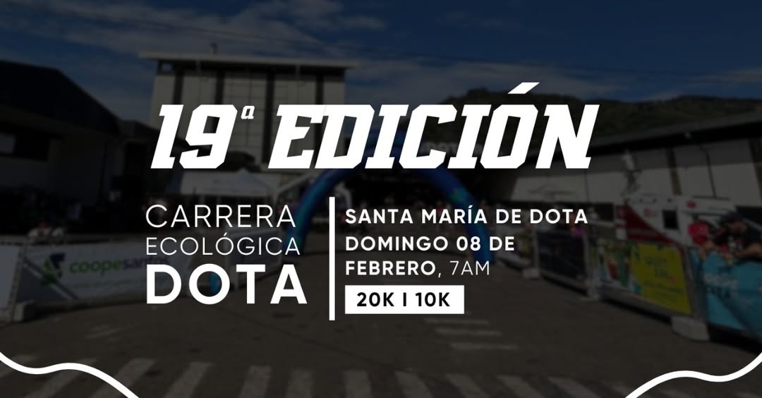 Descripción: La edición #19 de la Carrera Ecológica Dota tendrá recorridos de 5k, 10k y 20k con salida y meta en el parqueo de COOPEDOTA, en Santa María de Dota. El evento se realiza en el marco de las fiestas patronales del pueblo y el recorrido de 20k, con abundantes ascensos y sus correspondientes descensos, llega hasta reservas naturales de la zona, cruzando quebradas y respirando el aire puro de las montañas de la zona.