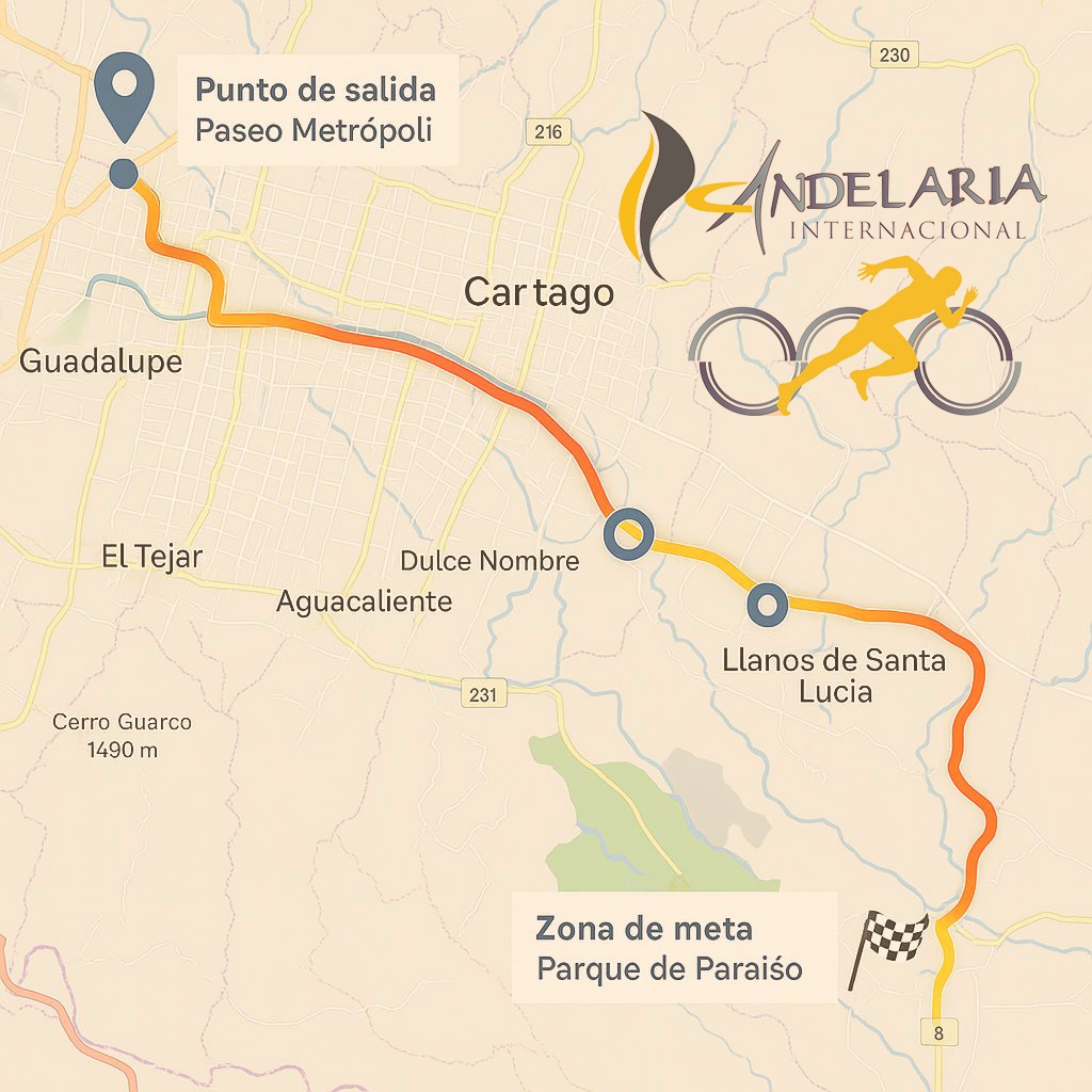 Descripción: La Clásica Internacional La Candelaria celebra su edición #43 consolidada como una de las carreras más prestigiosas del país, luego de más de cuatro décadas conservando su muy gustado recorrido de 10 kilómetros entre La Lima de Cartago y Paraíso. La salida será en el parqueo interno sur del Mall Paseo Metrópoli, y la meta, como es tradicional, será frente al parque de Paraíso. La carrera tiene un recorrido exacto de 10 kilómetros certificados por World Athletics, sumamente planos tirando a bajada, con un descenso neto de 88 metros, así que es excelente para lograr buenos tiempos.