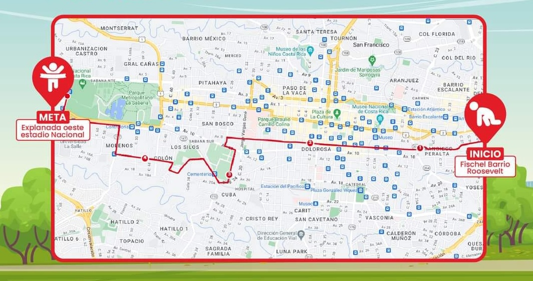 Descripción: Será la sétima edición de la carrera "8k Por Tu Bienestar", de Fischel, un evento que ha crecido y se ha hecho muy popular entre los corredores, no solo por su atractivo recorrido sino por la calidad del kit que reciben. La edición de este año conserva su recorrido rápido de 8.5 kilómetros que inician desde la Plaza Roosevelt, en San Pedro de Montes de Oca, y terminan en la explanada oeste del Estadio Nacional (ver mapa abajo).