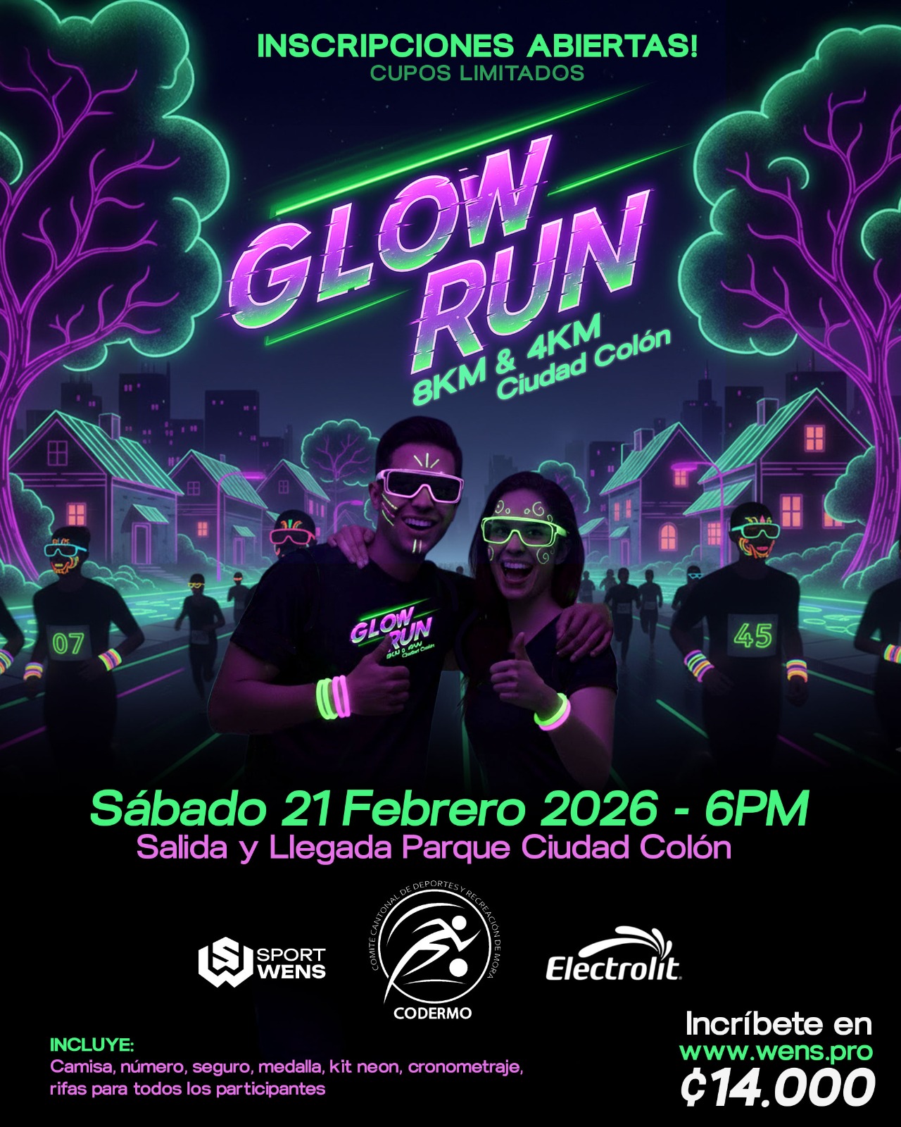 Descripción: La primera edición de Glow Run llega para llenar de energía y color las calles de Ciudad Colón. Será "una noche especial donde el deporte, la música y el ambiente se combinan en una experiencia única bajo luces de neón. Vas a correr entre calles iluminadas, buena vibra y un público que convierte cada paso en fiesta", dicen los organizadores. El evento tendrá recorridode 4k y 8k caon salida y meta en el parque de Ciudad Colón.