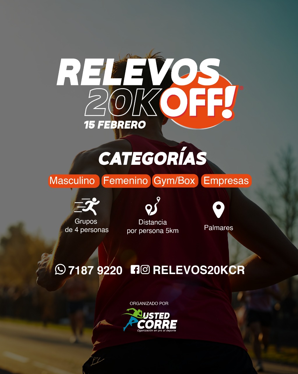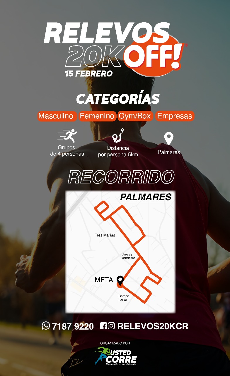 Descripción: La primera edición de los Relevos 20k OFF! tendrá un recorrido total de 20 kilómetros que se hará en equipos de 4 corredores, cada uno de los cuales correrá 5k. La salida y meta será frente a la Asociación Cívica Palmareña.