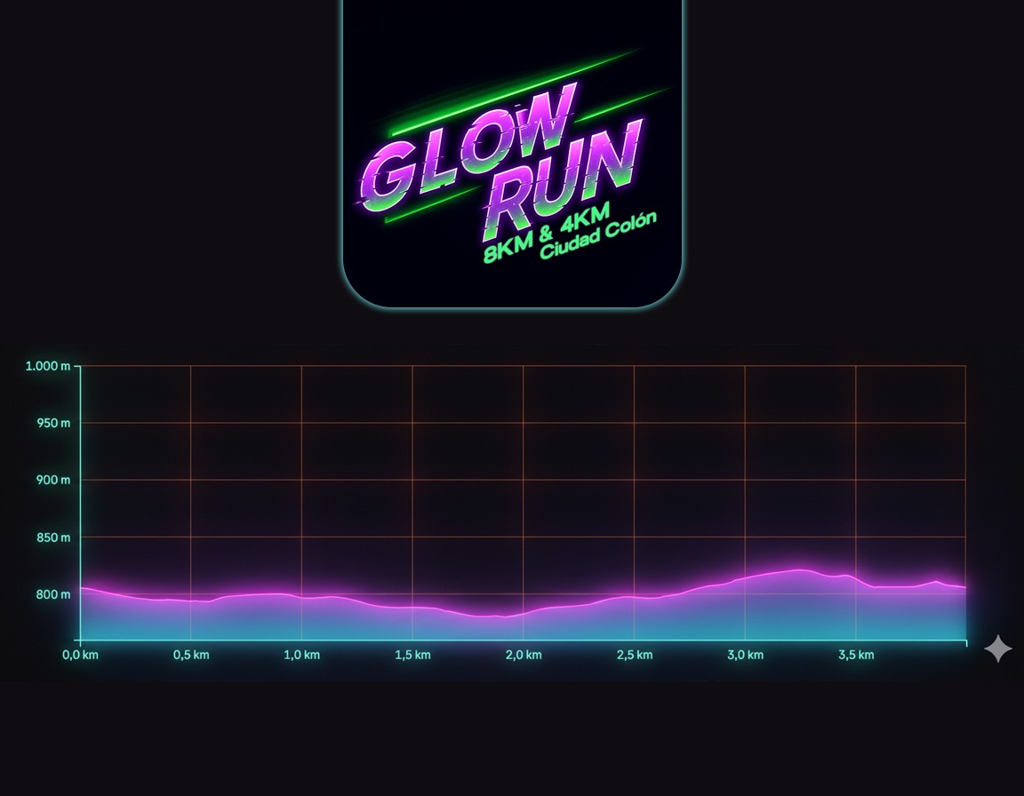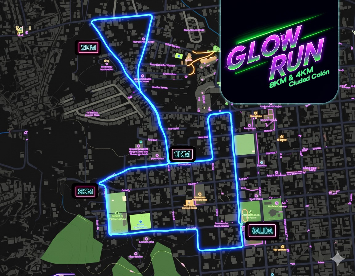Descripción: La primera edición de Glow Run llega para llenar de energía y color las calles de Ciudad Colón. Será "una noche especial donde el deporte, la música y el ambiente se combinan en una experiencia única bajo luces de neón. Vas a correr entre calles iluminadas, buena vibra y un público que convierte cada paso en fiesta", dicen los organizadores. El evento tendrá recorridode 4k y 8k caon salida y meta en el parque de Ciudad Colón.
