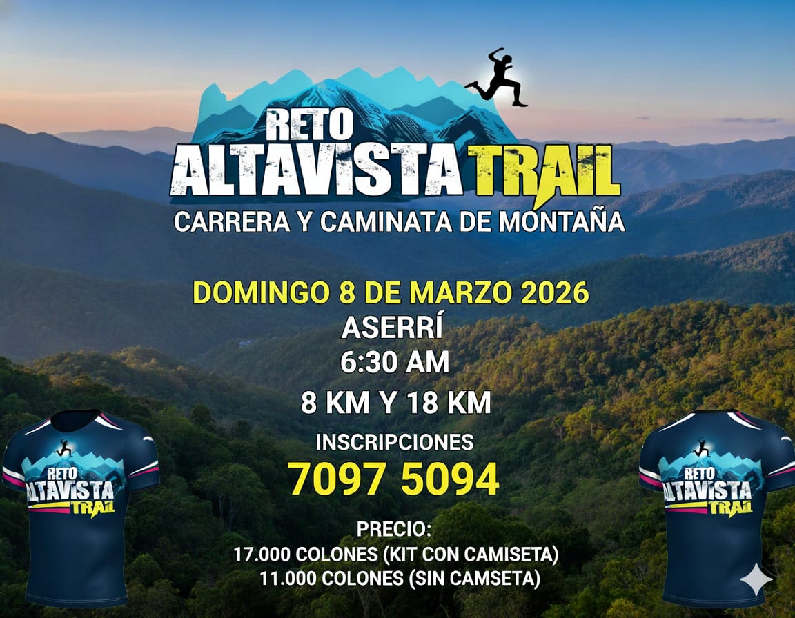 Descripción: La quinta edición de la Carrera de Montaña Reto Altavista tendrá recorridos de 8k y 18k con salida y meta frente al restaurante Los Lindos, en Aserrí.