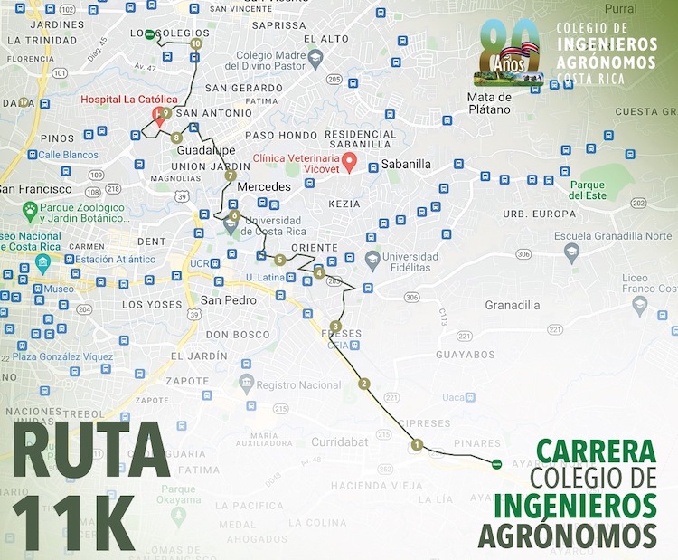 Descripción: La Carrera del Colegio de Ingenieros Agrónomos tendrá distancias de 5k, 11k y 21k con rutas muy rápidoas, especialmente la de 21k. Esta saldrá desde el Colegio de Veterinarios, en Ochomogo, y bajará todo Tres Ríos antes de pasar por Curri, San Pedro, Guadalupe y finalmente Moravia, con unos 245 de descenso neto. La ruta de 11k inicia frente al Colegio de Psicólogos, en Curridabat y sigue una ruta similar (ver mapas abajo) y los 5k tendrán como salida y meta el Colegio de Ingenieros Agrónomos, en Tibás. Los 21k saldrán a las 5:30 a.m., mientras que los 11k y 5k a las 6:00 a.m. También habrá carreras para niños entre los 4 y 11 años con salida y meta en las instalaciones del colegio de agrónomos a las 8:30 a.m.